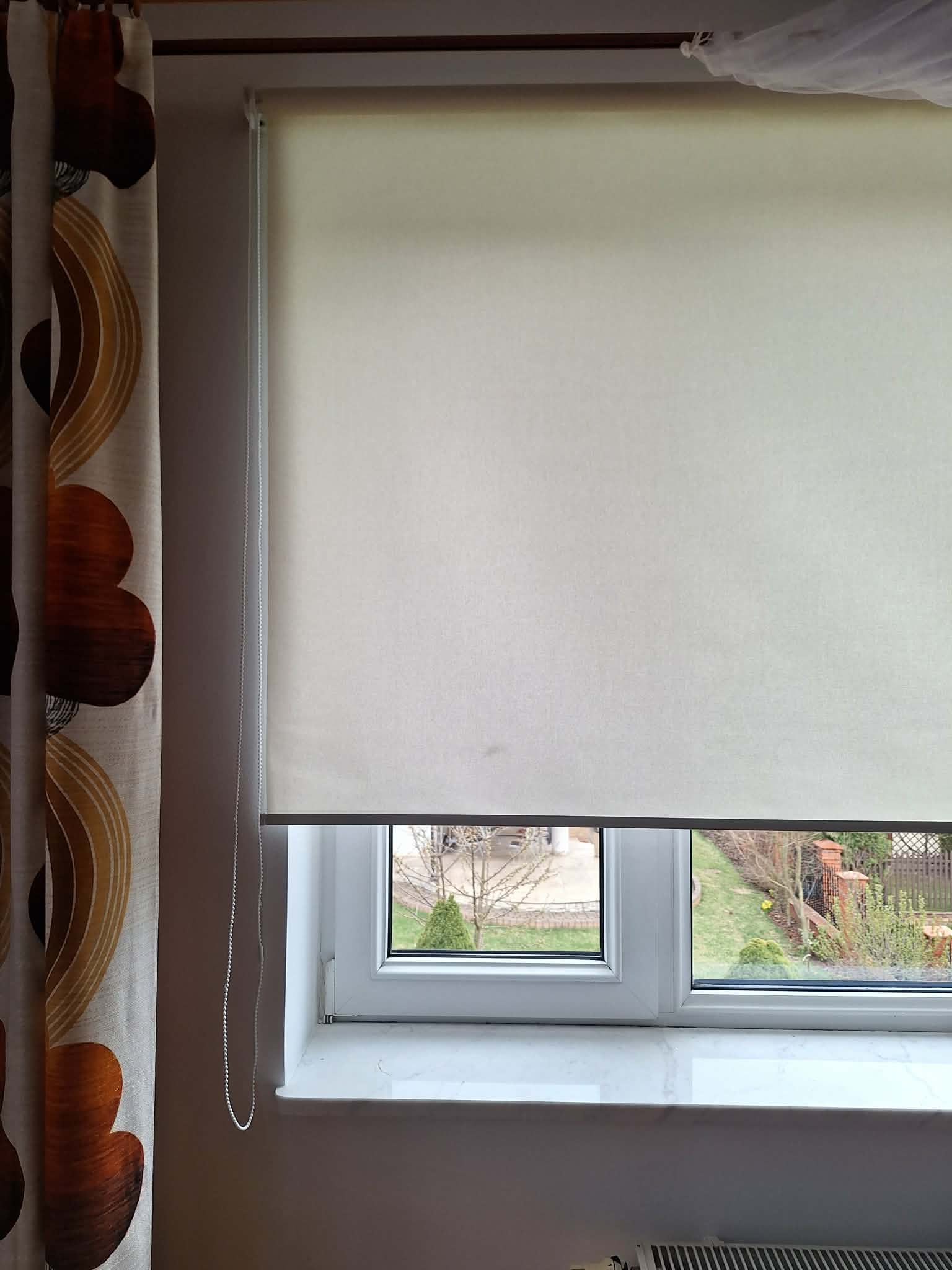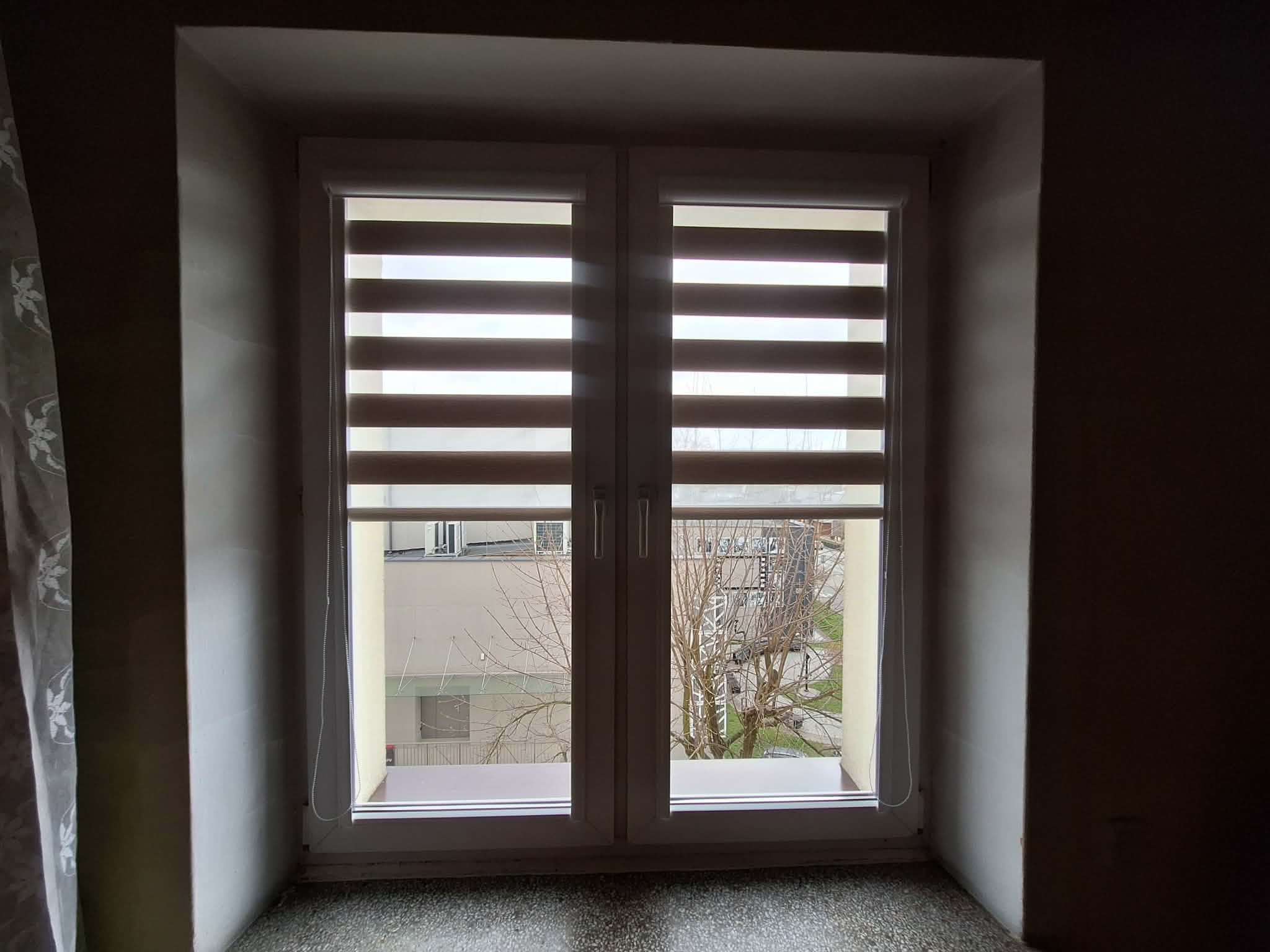 Montaż rolety wolnowiszącej. Materiał A637. Montaż do ściany. Dodatkowo zamontowano Moskitierę drzwiową w kolorze mahoń.