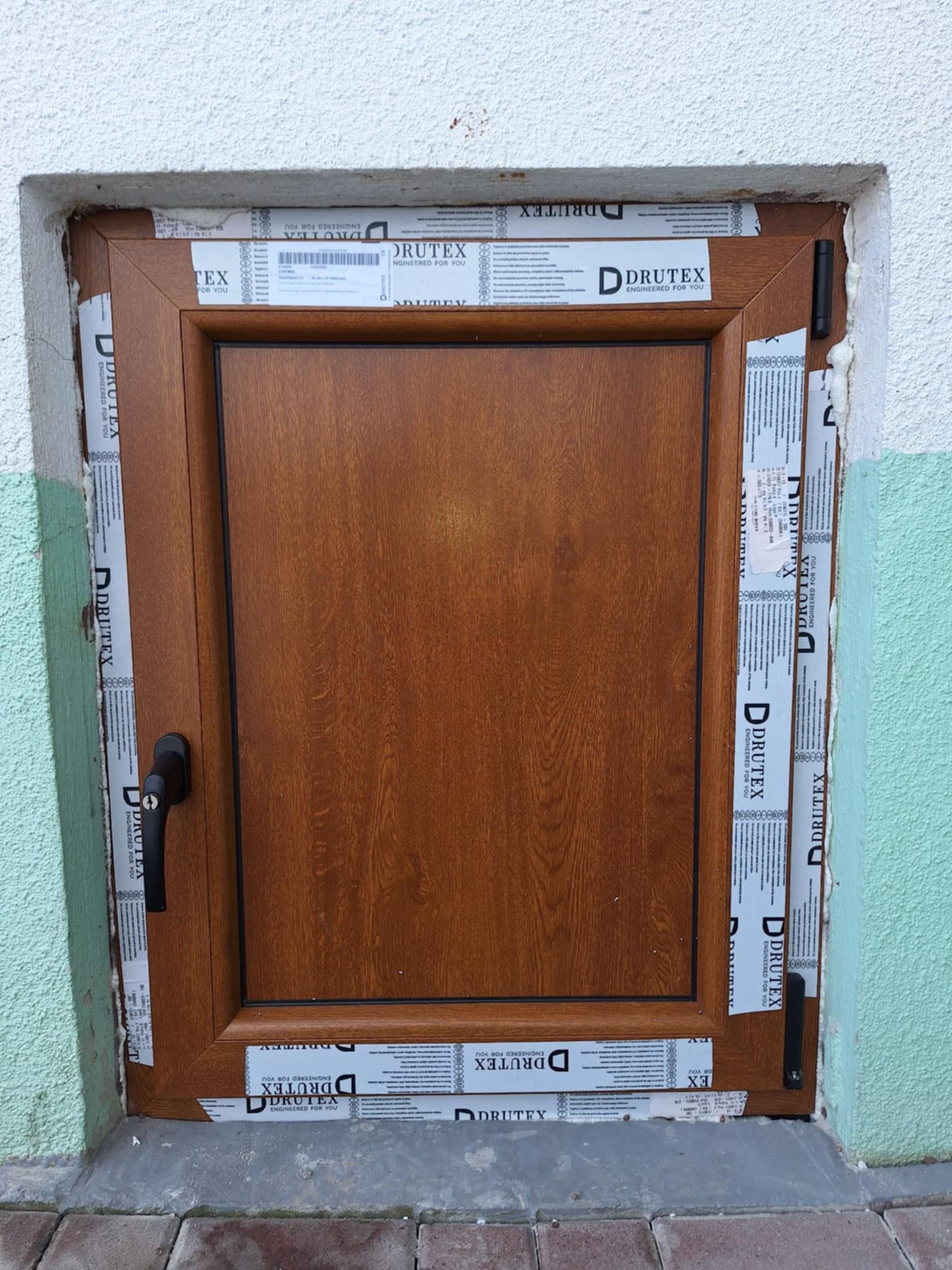 Okno Iglo 5 Clasic na profilu 5 - komorowym, kolor obustronnie złoty dąb wypełnione płytą PCV z klamka z kluczykiem.