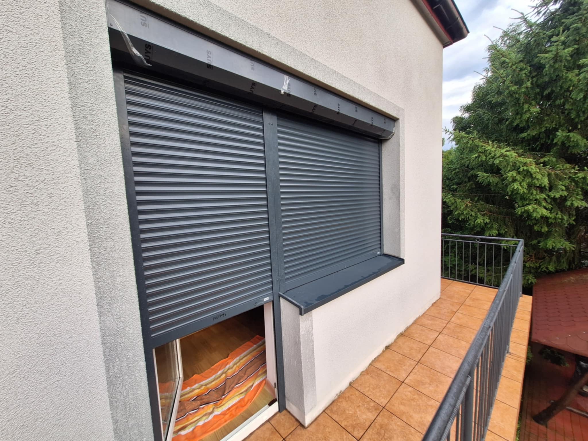 Montaż rolet zewnętrznych firmy Nitus. Rolety adaptacyjne w kolorze antracyt lakierowany, sterowanie przewodowe na włącznik.