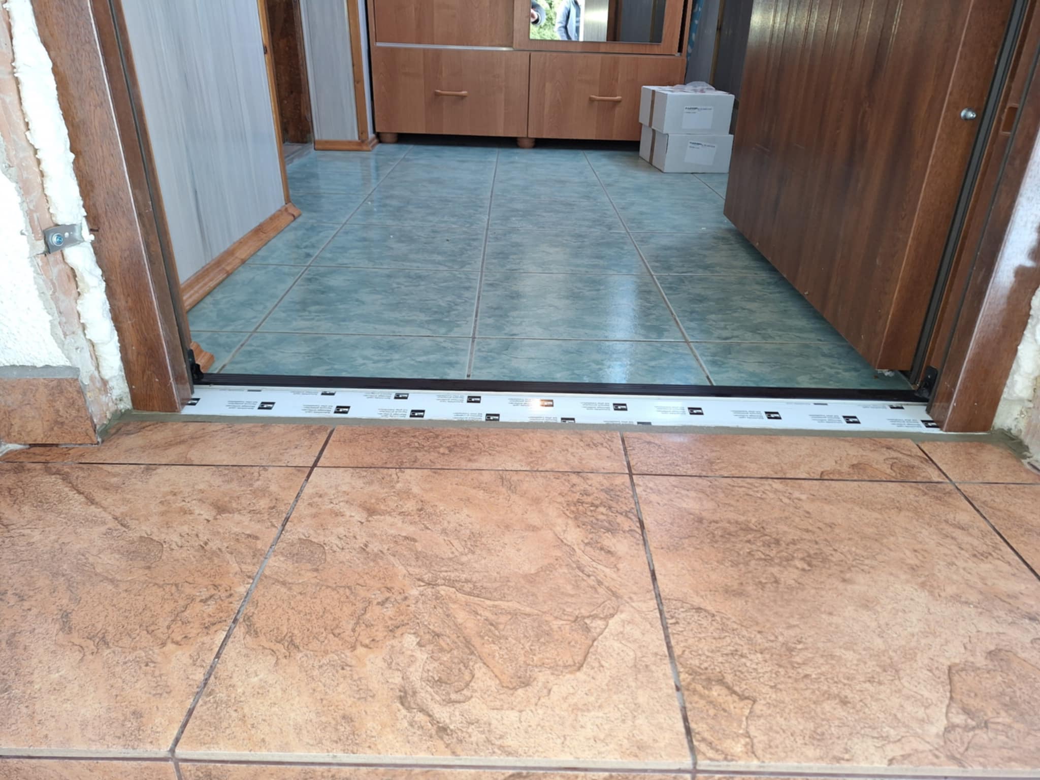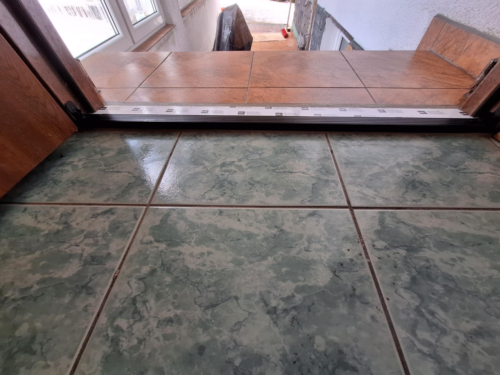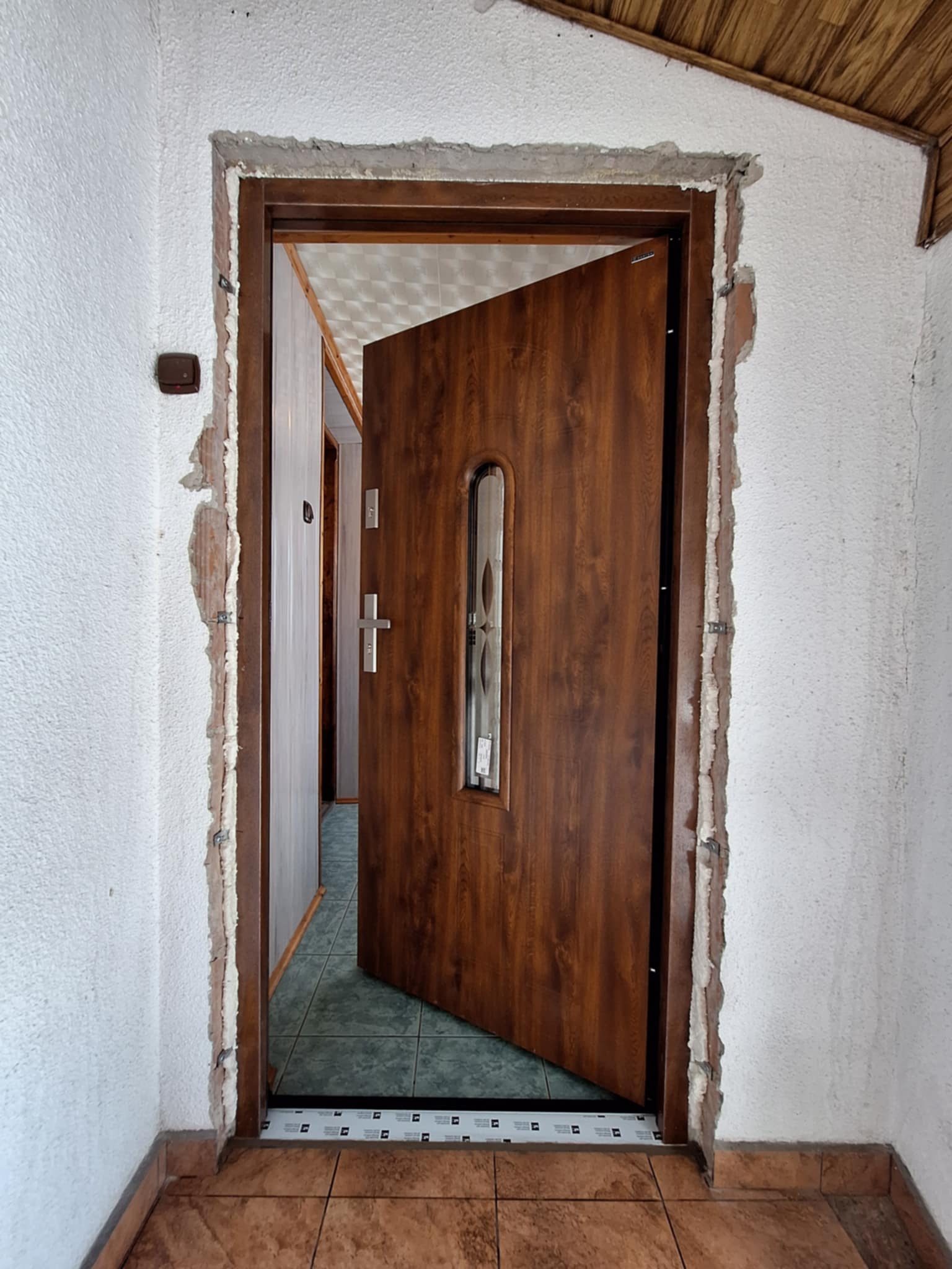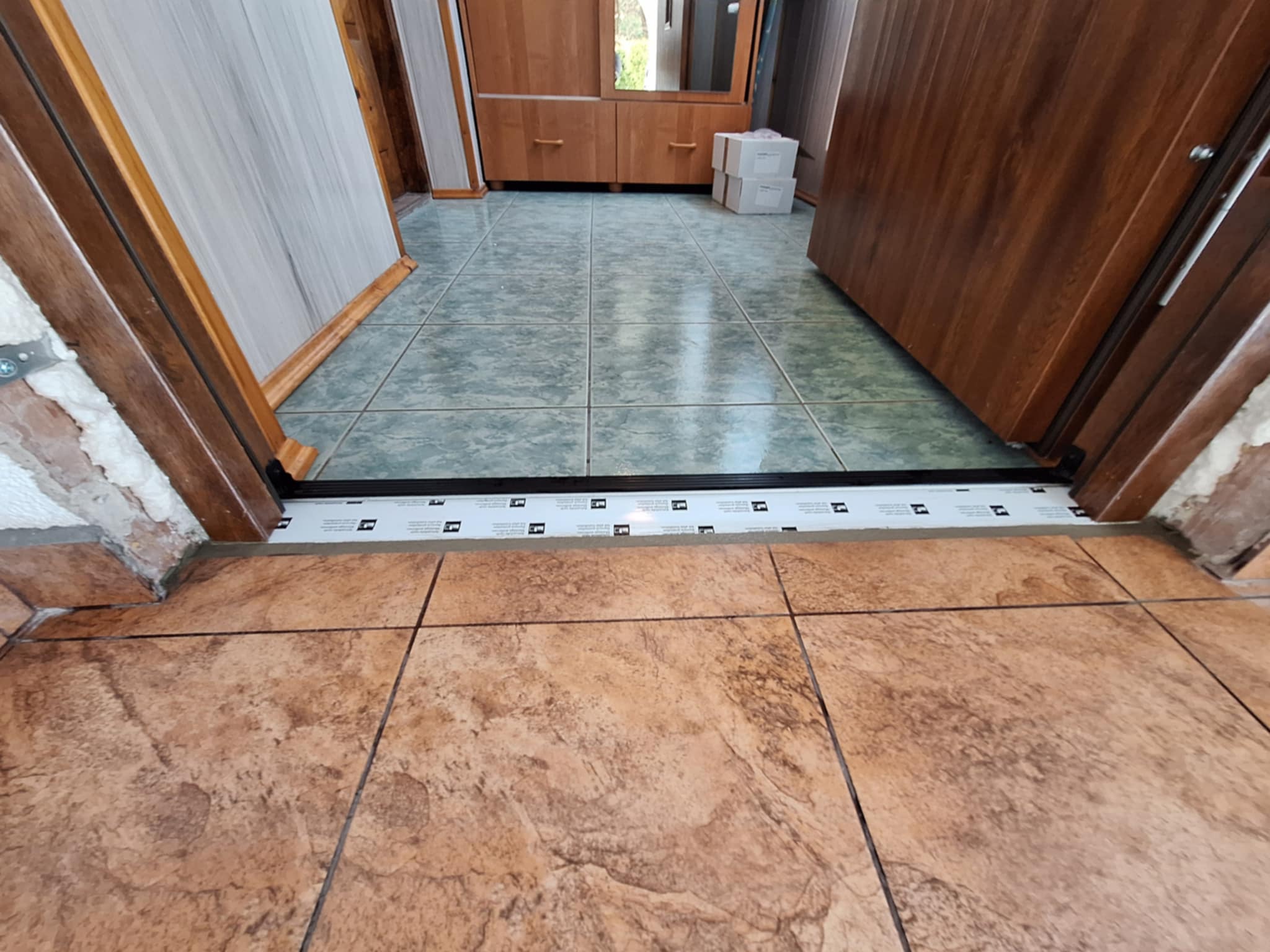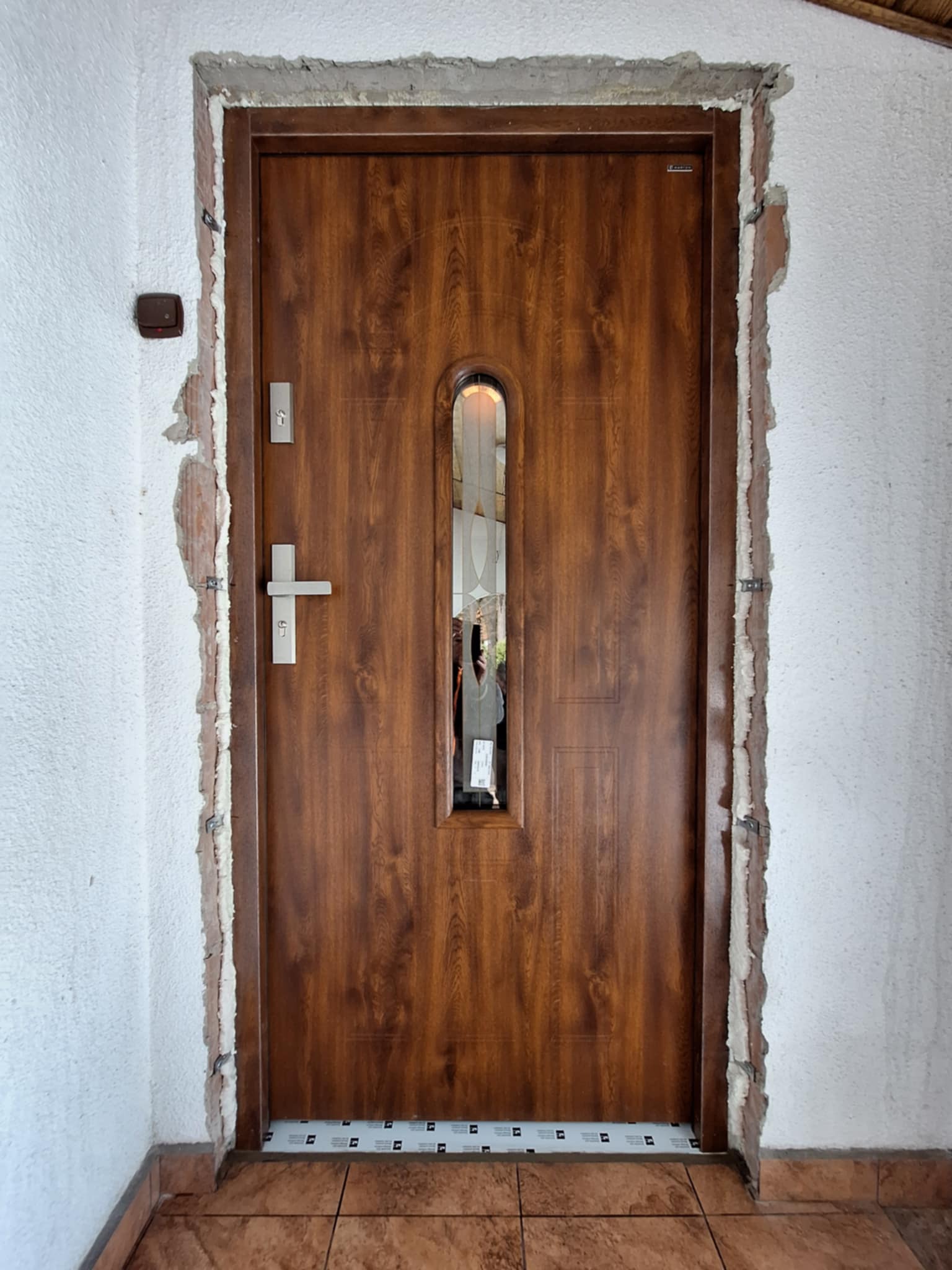 Demontaż i montaż wraz z obróbką i wykończeniem progu nowych drzwi firmy Martom 72 Arktic o grubości skrzydła 72 mm, wzór WK 43/42, kolor złoty dąb z przeszkleniem witraż 42E DRUK – witraż na ościeżnicy metalowo- drewnianej ze srebrnymi okuciami z progiem aluminiowym.
