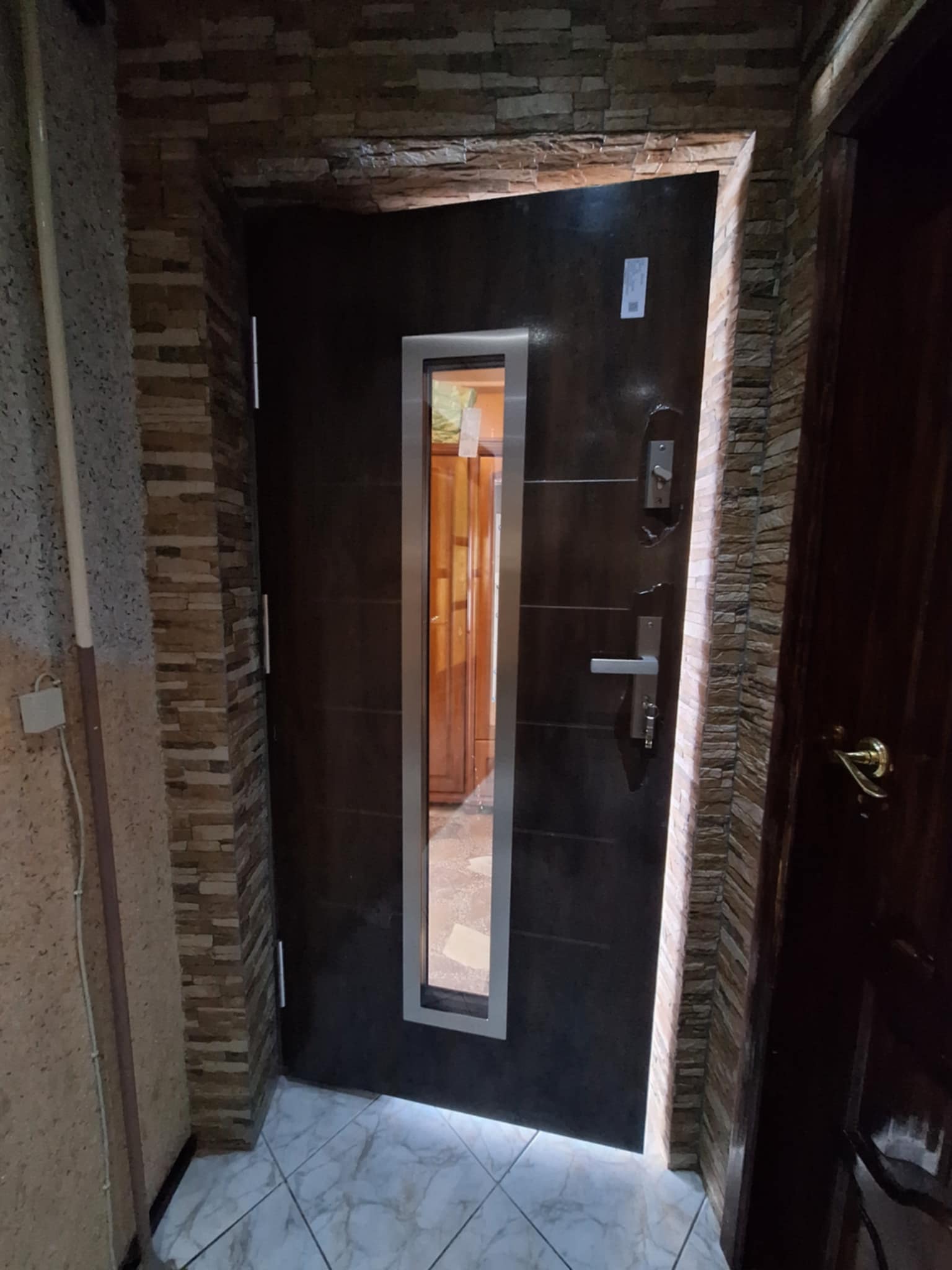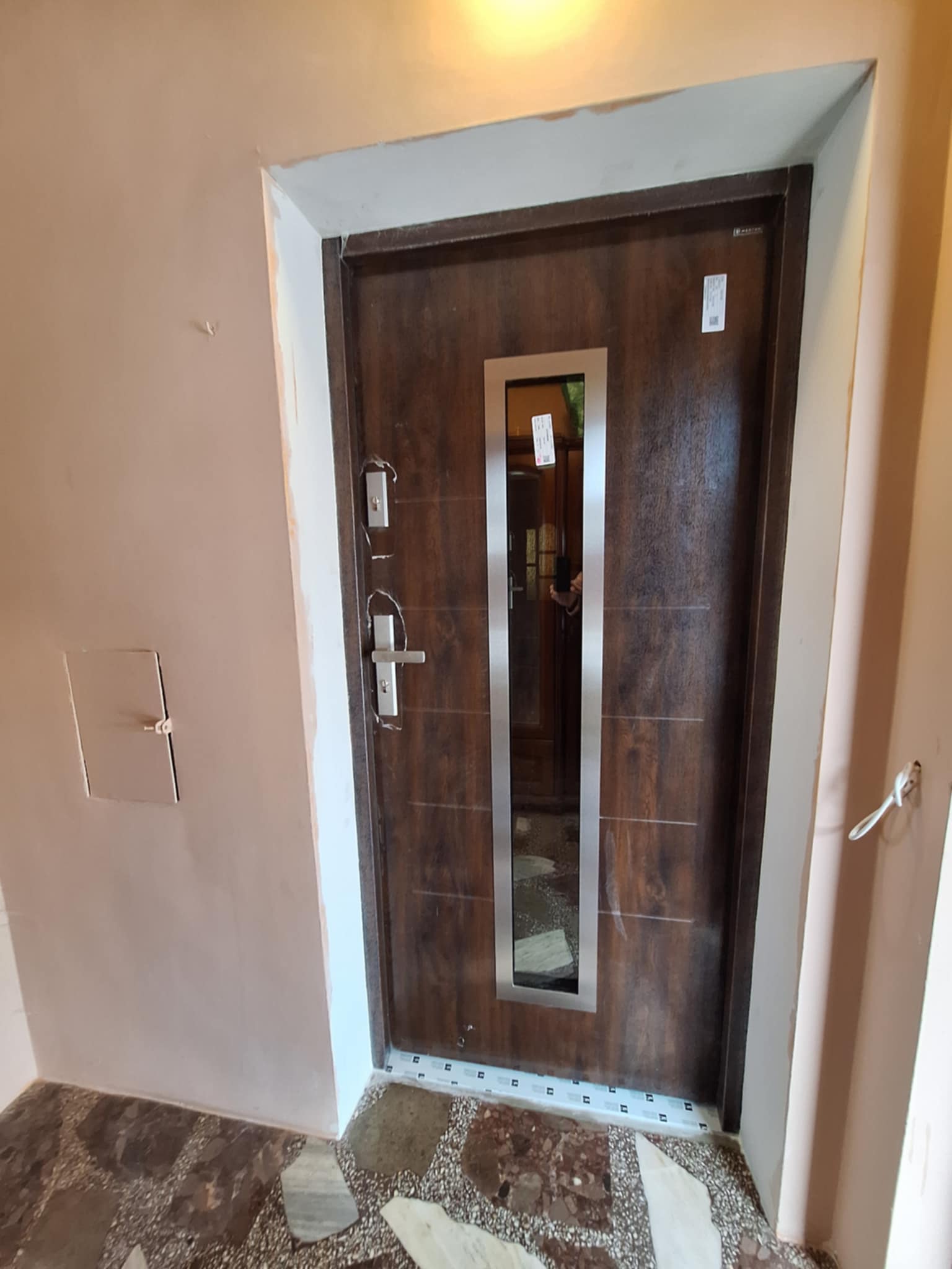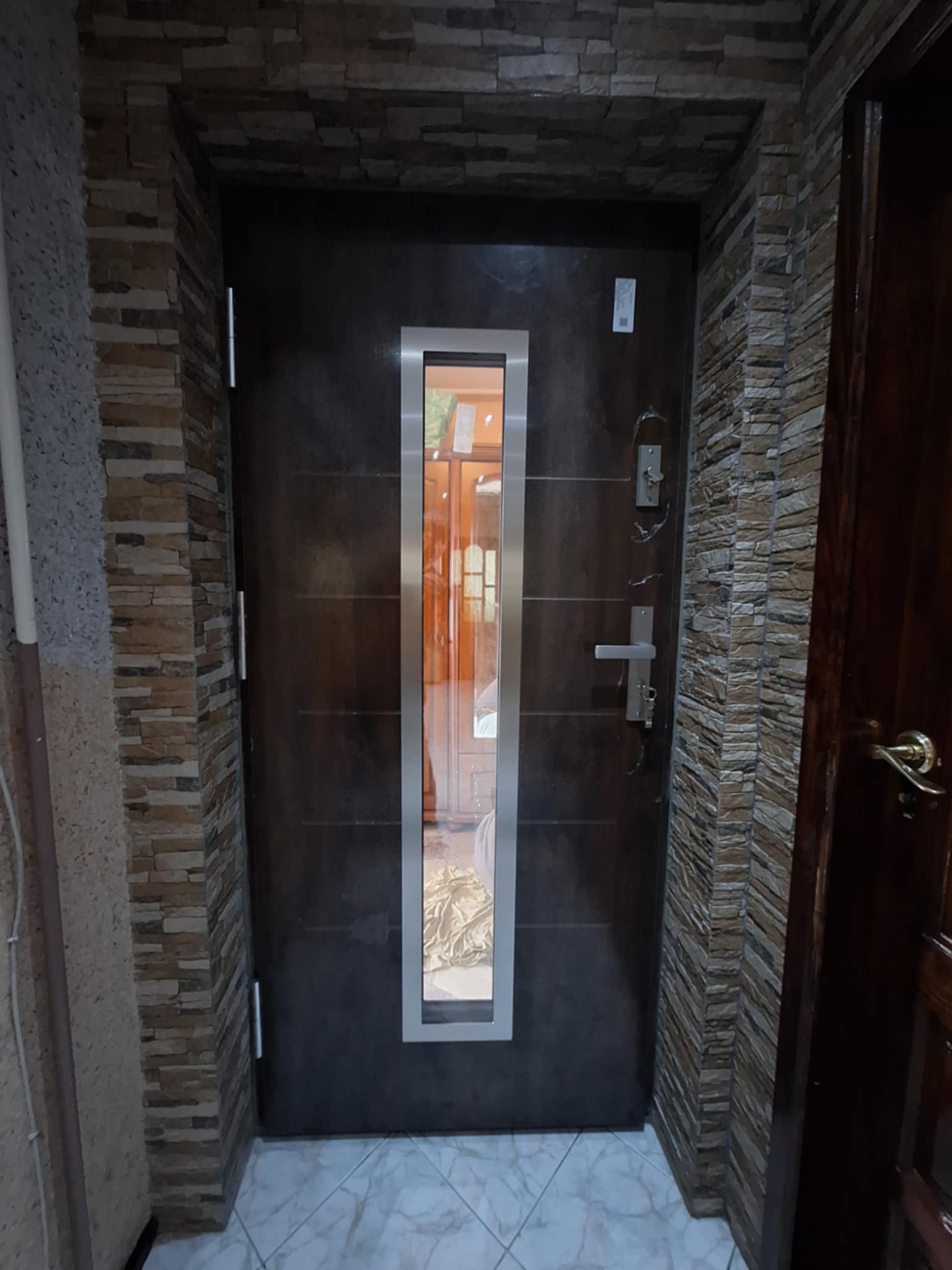 Drzwi Arktic 72 wzór F 61/56 w kolorze orzech ciemny o grubości skrzydła 72 mm – wypełnienie pianą poliuretanową. Ościeżnica z blachy stalowej z wypełnieniem drewnianym oraz aluminiowym progiem. Przeszklenie w drzwiach szyba reflex brąz z ramką oraz okuciami w kolorze srebrnym. Zamek główny, jak i dodatkowy 3 – bolcowy.